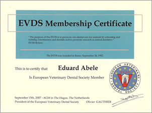 Zahnheilkunde Dr. Abele hat seit 1993 die Berechtigung zum Führen der Zusatzbezeichnung "Tierzahnheilkunde" und seit 1994 die Weiterbildungsbefugnis auf diesem Gebiet. Zudem gehört Dr. Abele seit Ende 2013 zu den wenigen Fachtierärzten für Zahnheilkunde der Kleintiere in Bayern und ab 2014 hat die Praxis die Weiterbildungsermächtigung für Fachtierärzte der Zahnheilkunde für Kleintiere erhalten, so dass zu der Zusatzbezeichnung, eine weitere Qualifizierung für Zahnheilkunde erworben wurde. . Unsere Praxis verfügt über eine spezielle Zahnbehandlungsstation